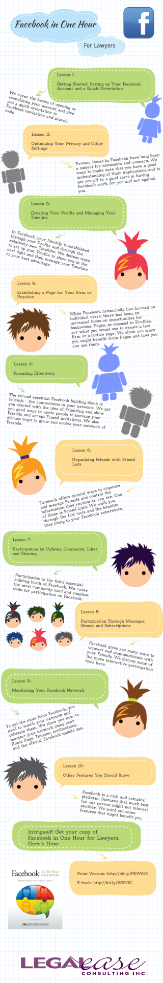 October 29, 2019November 7, 2012 by Allison Johs Here’s an infographic that gives an overview of the Lessons contained in Facebook in One Hour for Lawyers: Related